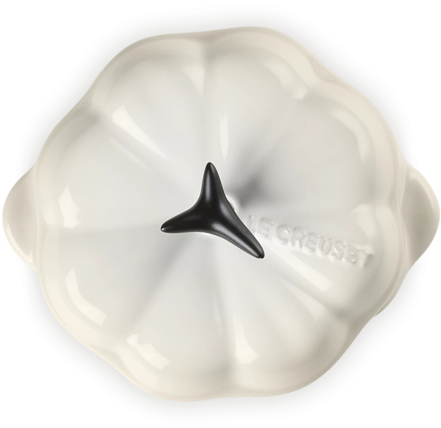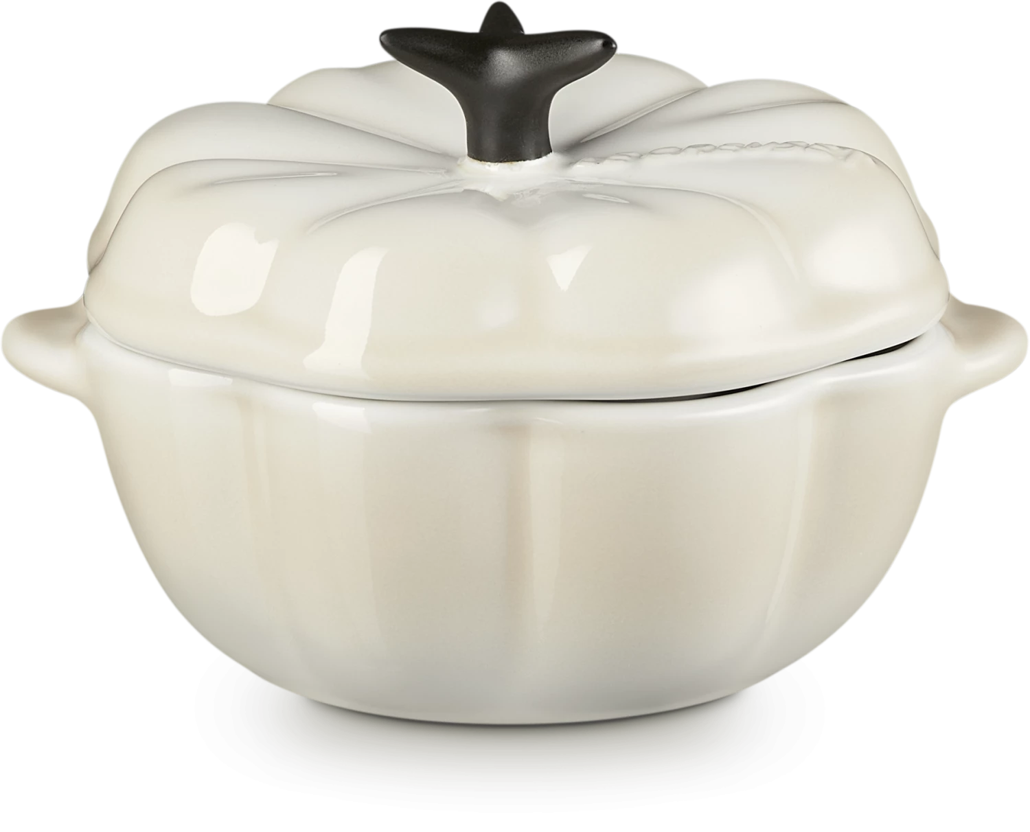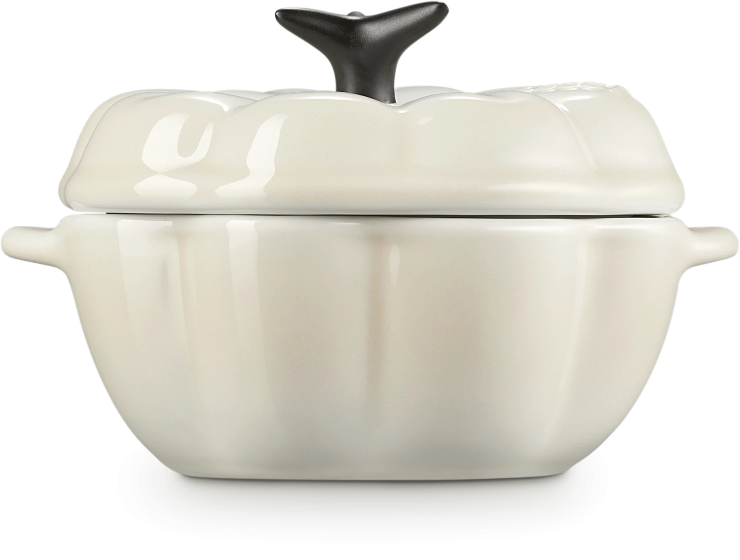 Le Creuset Kürbisförmchen mit Deckel in meringue. Vielfältig einsetzbares Serviertöpfchen in glänzender Farbe und Kürbisform.