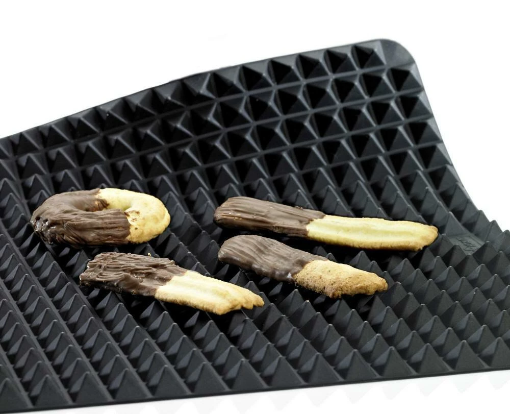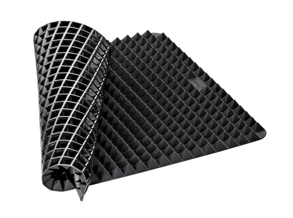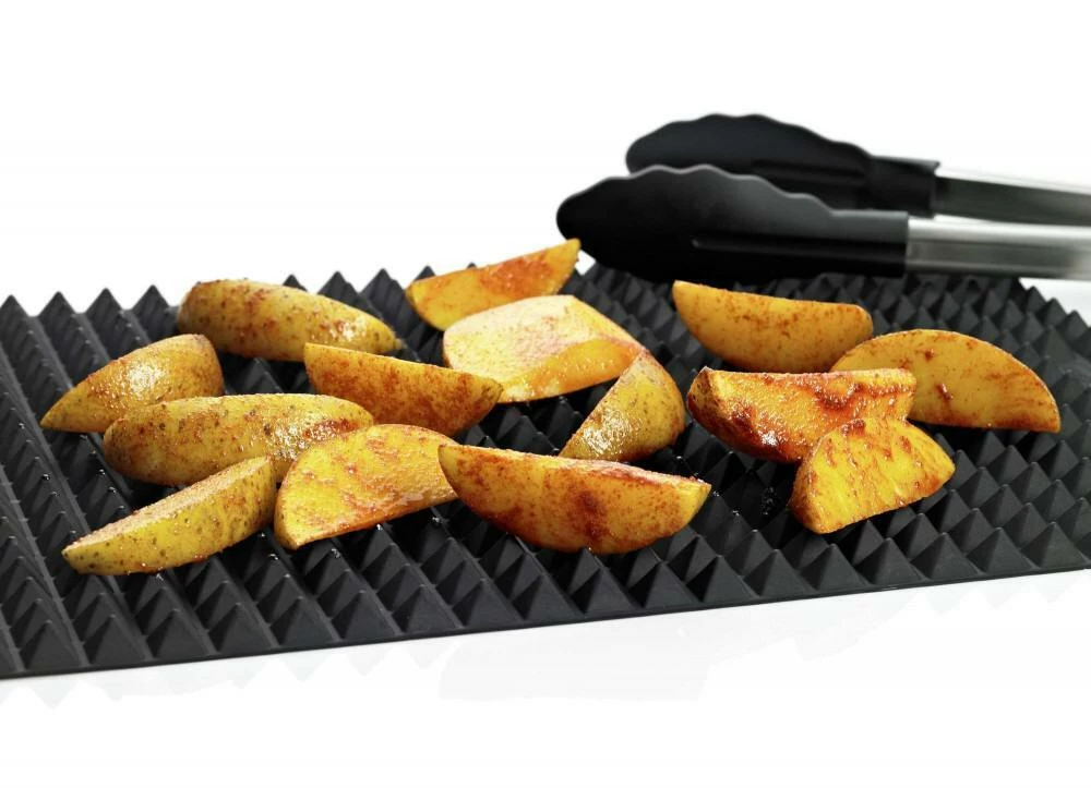 Durch die Pyramidenstruktur der Matte besteht ein Abstand zum Back-/Bratgut. Überschüssiges Fett kann in die Zwischenräume abtropfen und durch die Luftzirkulation wird das Back- und Bratgut (z.B. Chicken Wings, Kartoffelecken, Pommes oder Plätzchen) besonders knusprig. Außerdem eignet sich diese FLEXI®FORM-Matte auch als Trocknungsunterlage beim Backen.