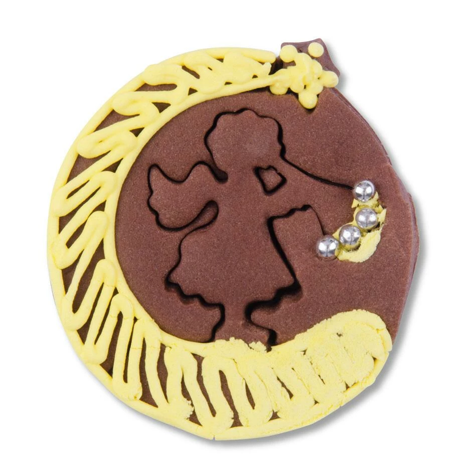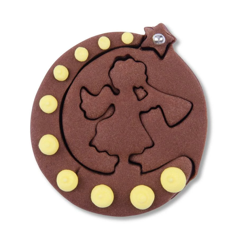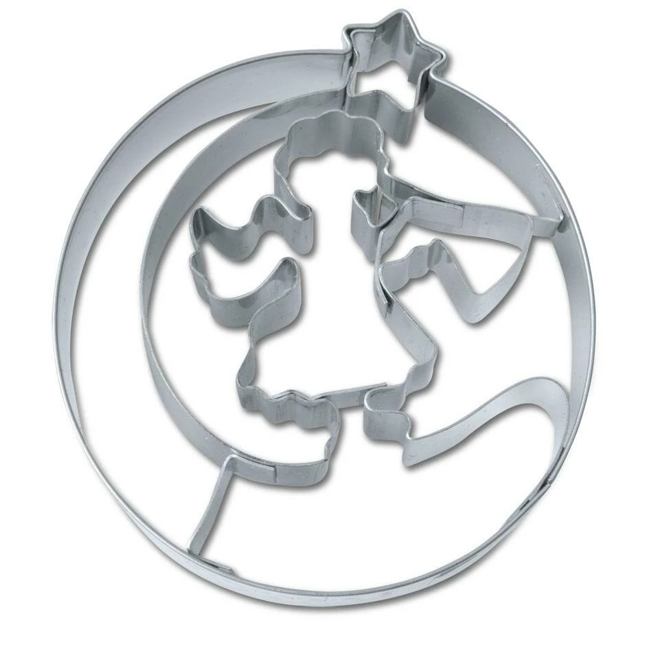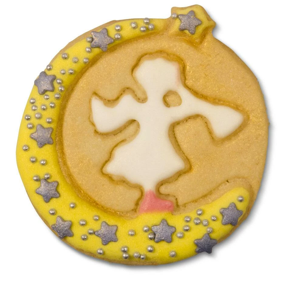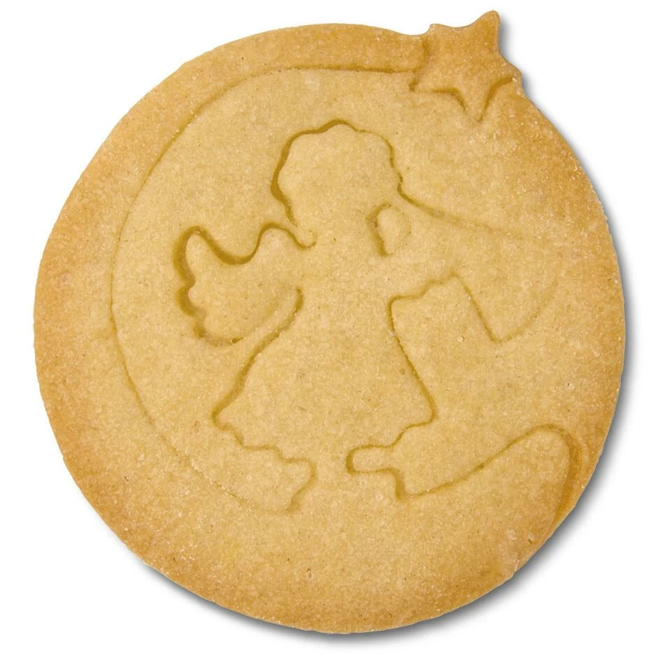 Dieser Ausstecher prägt auf rundem Untergrund einen putzigen kleinen Blasengel mit Flügelchen und Trompete vor.