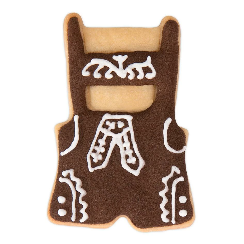 Die typische bayerische Lederhose hat ein Hosentürl, kurze Beine und H-Hosenträger. Unser Trachten-Ausstecher hat all das natürlich auch.