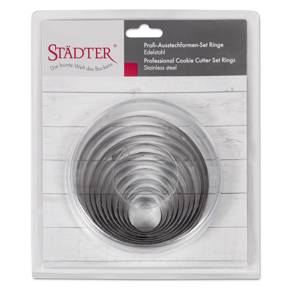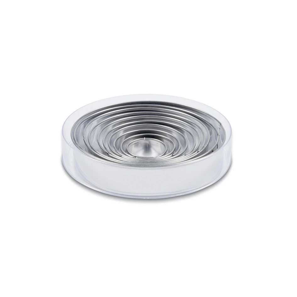 Zum Backen, Dekorieren und Basteln: Mit diesem Set ineinander stapelbarer Ringe können Sie Kreise mit zehn verschiedenen Durchmessern ausstechen.