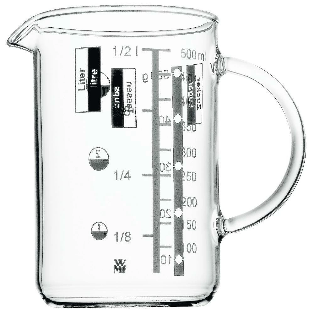 WMF Messbecher Gourmet aus Glas, 0,5 Liter. Angabe der Messkalen in Liter, Milliliter, Tassen und Gramm.