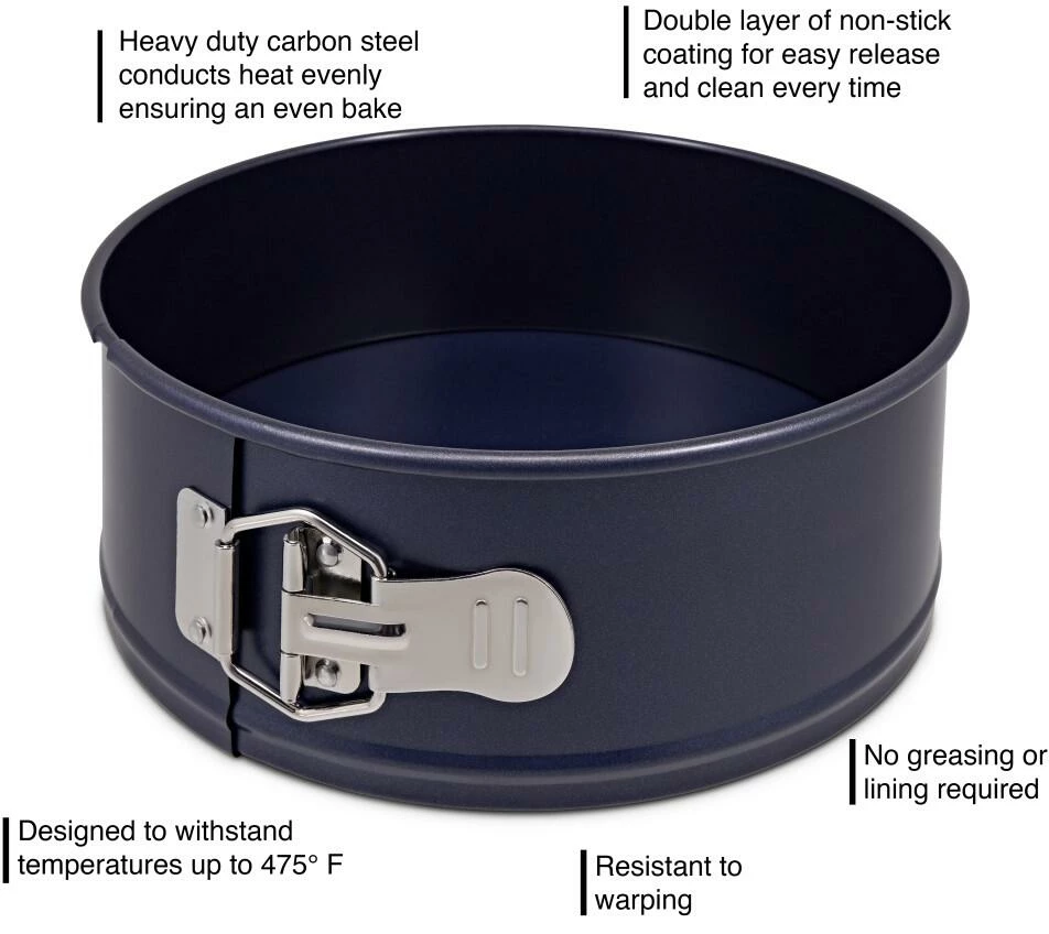 Diese Springform mit ihren ausgesprochen glatten Innenflächen hinterlässt keine Eindrücke in Ihrem Kuchen und ist ideal geeignet für Käsetorten und klassische, runde Backwaren wie vom Bäcker. Dank der doppelten Antihaftbeschichtung lässt sich das Backwerk jedes Mal leicht aus der Springform lösen. Hergestellt aus robustem, formstabilen Karbonstahl ist es leicht zu reinigen. Einfach in warmem Seifenwasser von Hand waschen, abspülen und gründlich trocknen oder in den Geschirrspüler geben. Wie bei allen Metallwaren mit Antihaftbeschichtung sollten niemals Topfkratzer oder aggressive Scheuermittel verwendet werden.